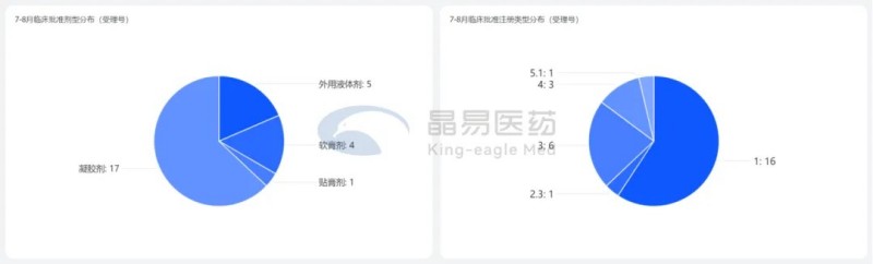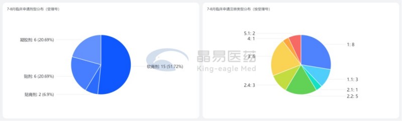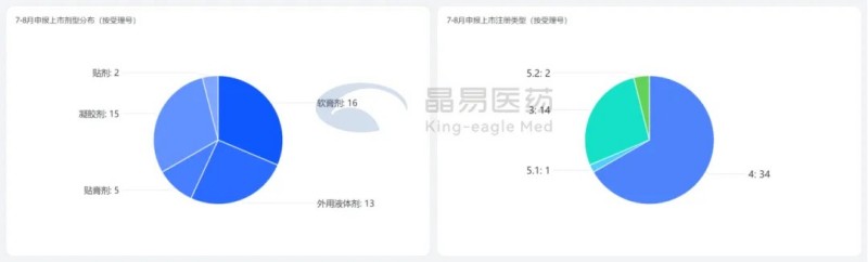 從劑型分布看,各劑型占比基本與上半年相同。貼膏貼劑共7個(gè)受理號,依舊是洛索洛芬和氟比洛芬2個(gè)熱門品種。值得注意的是,洛索洛芬鈉凝膠貼膏原研企業(yè)LEAD在退市后又重新提交上市,7月申請獲受理。
